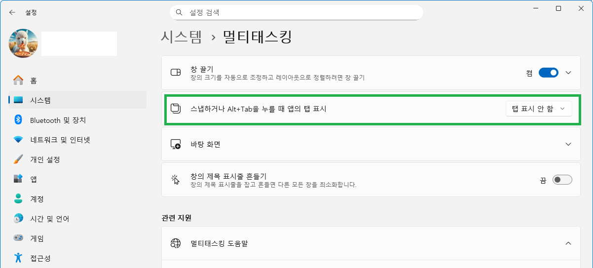 - [스냅하거나 Alt+Tab을 누를 때 앱의 탭 표시]를 "탭 표시 안 함"으로 변경합니다.
