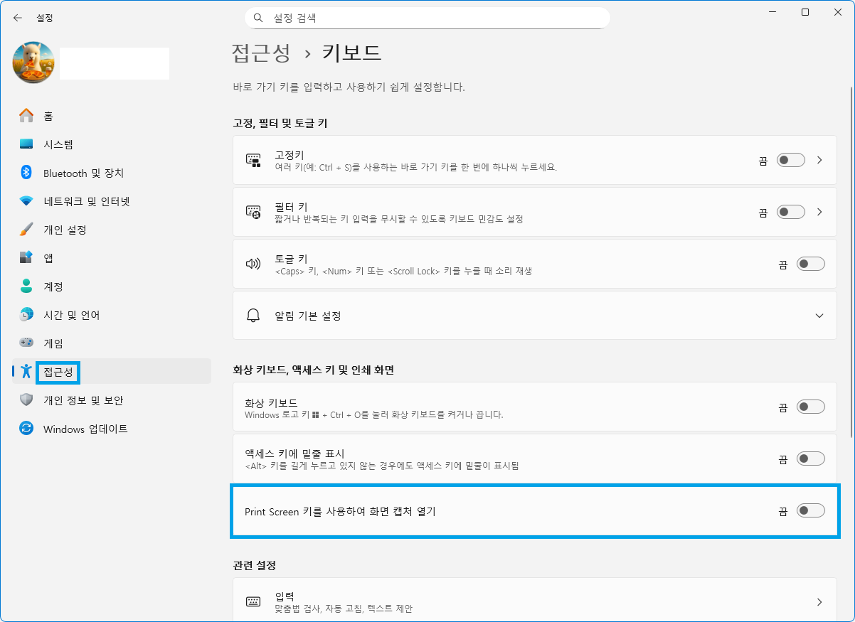 - [Print Screen 키를 사용하여 화면 캡처 열기] 상태를 "끔"으로 변경하여 비활성화 시켜줍니다..